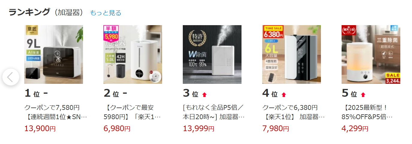 そんな中で楽天で最新のランキングが発表になっていましたので(2025/11/04)、5位までに入っている機種の徹底比較を行いましたのでよろしければ、加湿器選びの参考にしてください。