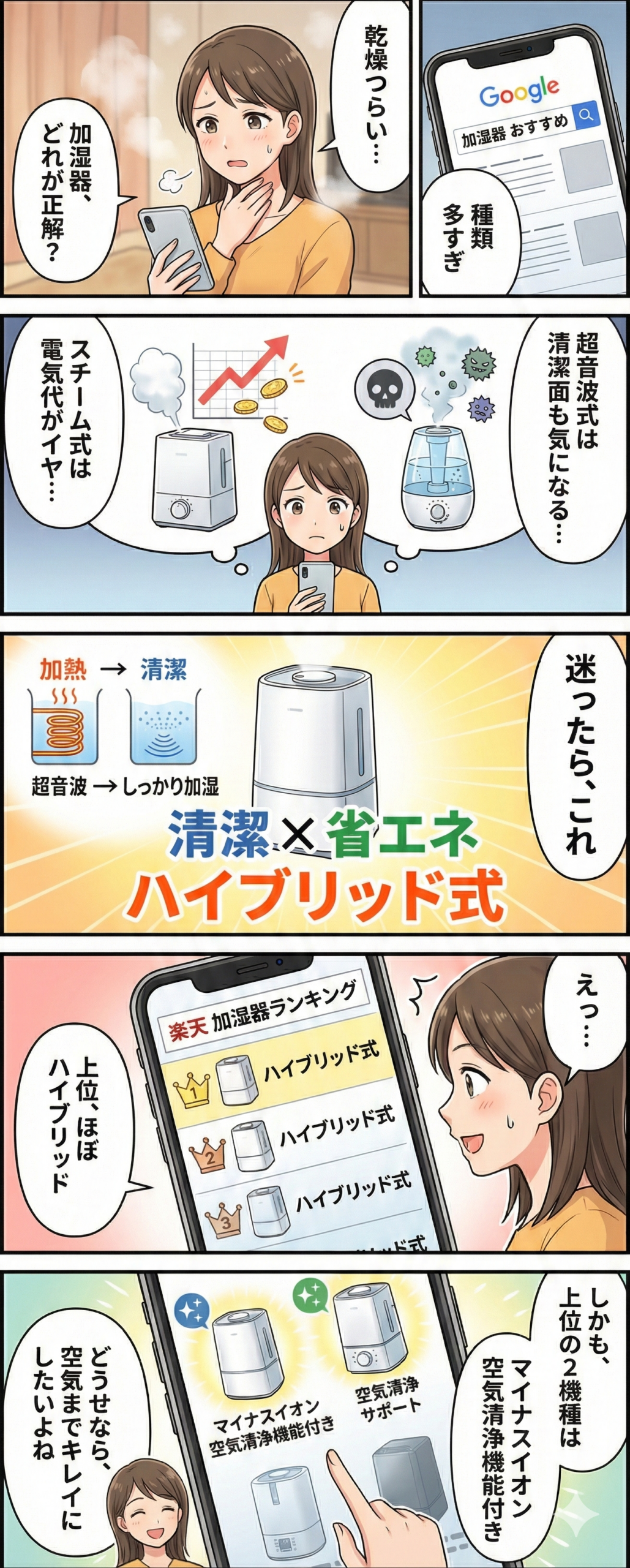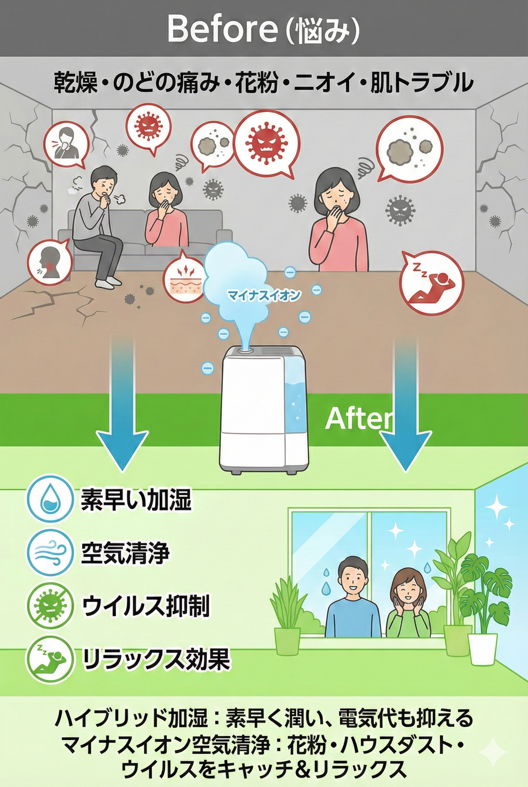 🌿 マイナスイオン空気清浄機能付きの「ハイブリッド式」が選ばれる理由
